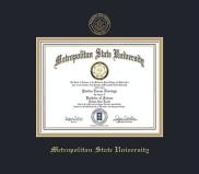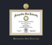 Metropolitan State University Diploma (8.5 x 11) Frame with Medallion and Black and Gold Double Mat and Gold Embossing(Approximate frame size 17 x 19 inches)