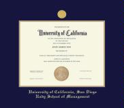 University of California- San Diego Diploma - Rady School of Management Frame with Medallion and Navy Blue and Gold Double Mat and Gold Embossing(Approximate frame size 17 x 19 inches)