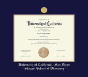 University of California- San Diego Diploma - Skaggs School of Pharmacy Frame with Medallion and Navy Blue and Gold Double Mat and Gold Embossing(Approximate frame size 19 x 22 inches)