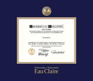 University of Wisconsin - Eau Claire Diploma (7/25 to Present) Frame with Medallion and Navy Blue and Gold Double Mat and Gold Embossing(Approximate frame size 17 x 19 inches)