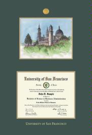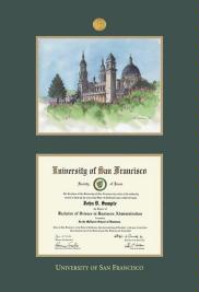 University of San Francisco Diploma - Master/Doctorate and Lithograph Frame with Green and Gold Double Mat and Gold Embossing(Approximate frame size 25 x 17 inches)