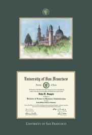 University of San Francisco Diploma - Bachelor and Lithograph Frame with Green and Gold Double Mat and Gold Embossing(Approximate frame size 24 x 16 inches)
