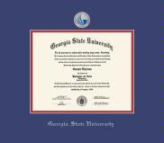 Georgia State University Diploma - PhD (10/22 to Present) and (Pre 9/24) Assoc/BA/MA Frame with Medallion and Royal Blue and Red Double Mat and Silver Embossing(Approximate frame size 21 x 24 inches)