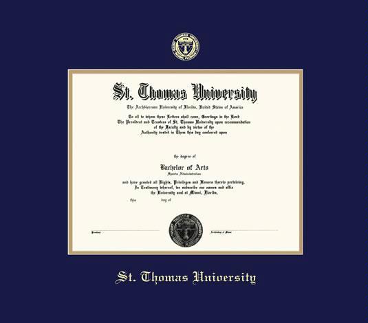 St. Thomas University Diploma - BA/MA Frame with Navy Blue and Gold Double Mat and Gold Embossing
