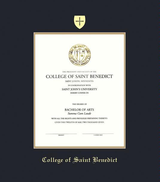College of Saint Benedict Diploma (4/07 to Present) Frame with Black and Gold Double Mat and Gold Embossing
