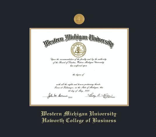 Western Michigan University Diploma - Haworth College of Business Frame with Medallion, Black and Gold Double Mat, and Gold Embossing
