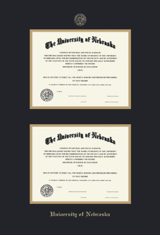 University of Nebraska Double Diploma - BA/MA/PhD Frame with Black and Gold Double Mat and Gold Embossing