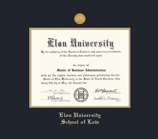 Elon University Diploma - Law (9/01 to Present) with Medallion Frame Featuring a Black and Gold Double Mat with Gold Embossing