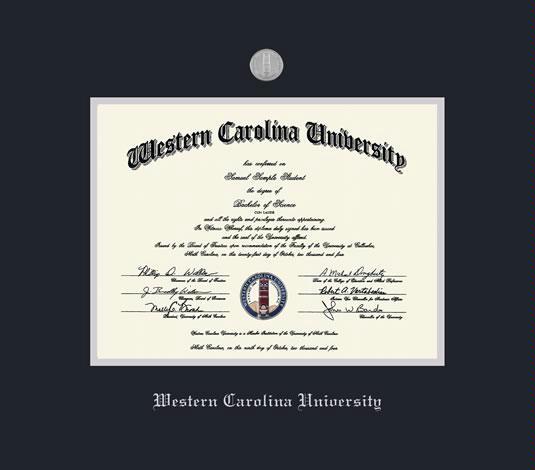 Western Carolina University Diploma - BA and (Pre 9/06) MA with Silver Medallion Frame Featuring a Black and Silver Double Mat with Silver Embossing
