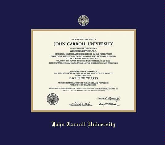 John Carroll University Diploma Frame with Navy Blue and Gold Double Mat and Gold Embossing