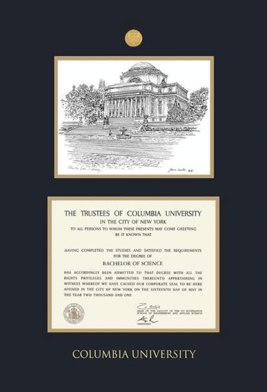 Columbia University Diploma (Pre 6/19) and Litho Frame with Medallion and Black and Gold Double Mat and Gold Embossing