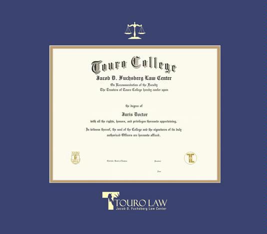 Touro College Law Center Diploma - Law (1/07 to Present) Frame with Royal Blue and Gold Double Mat and Gold Embossing