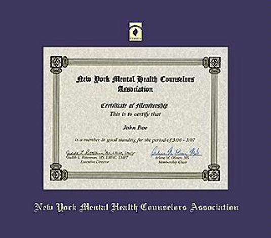 New York Mental Health Counselors Association Certificate - Membership Frame with Navy Blue Mat and Gold Embossing