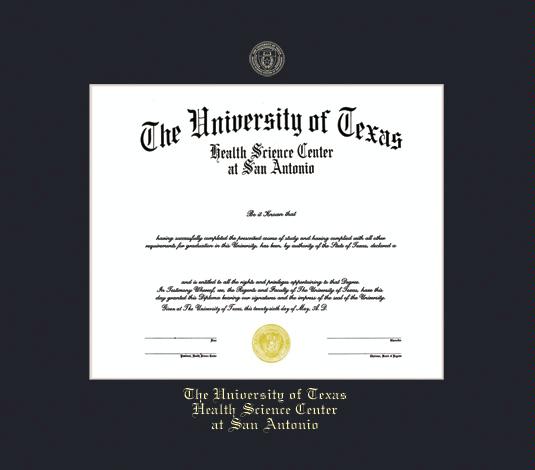 The University of Texas Health Science Center at San Antonio Diploma - Nursing and MD (4/06 to Present) Frame with Black Mat and Gold Embossing