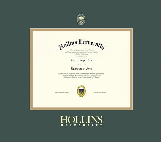 Hollins University Diploma (7/98 to Present) Frame with Green and Gold Double Mat and Gold Embossing