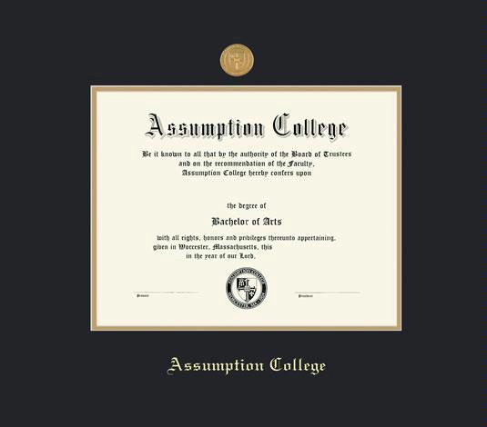 Assumption College Diploma (Pre 9/20) Frame with Medallion and Black and Gold Double Mat and Gold Embossing