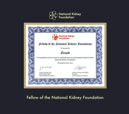 National Kidney Foundation Certificate - Fellowship Frame with Black and Gold Double Mat and Gold Embossing