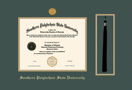 Southern Polytechnic State University Diploma - BA/MA Frame with Medallion and Tassel Cut-out and Green and Gold Double Mat and Gold Embossing
