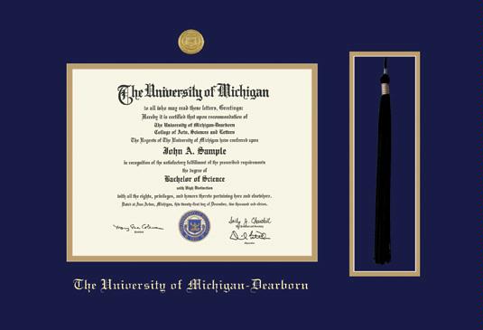 University of Michigan - Dearborn Diploma (2012 to Present) Frame with Medallion and Tassel Cut-out and Navy Blue and Gold Double Mat and Gold Embossing