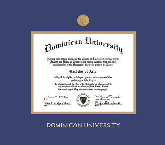 Dominican University Diploma Frame with Medallion and Royal Blue and Gold Double Mat and Gold Embossing