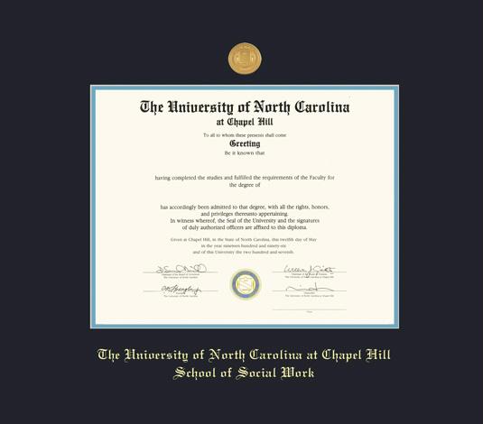 University of North Carolina at Chapel Hill Diploma - School of Social Work Frame with Medallion and Black and Sky Blue Double Mat and Gold Embossing