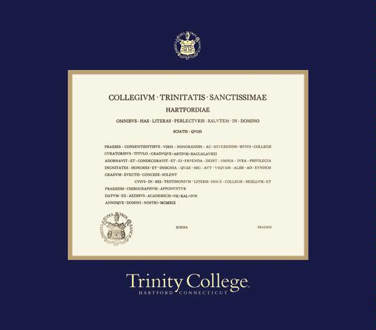 Trinity College (CT) Diploma (6/13 - 2022) Frame with Navy Blue and Gold Double Mat and Gold Embossing