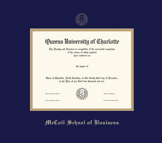 Queens University of Charlotte Diploma - Business (7/13 to Present) Frame with Navy Blue and Gold Double Mat and Gold Embossing