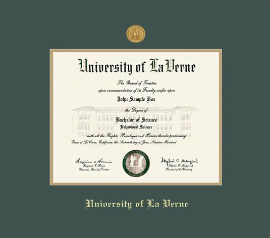 University of Laverne Diploma BA/MA Frame with Medallion and Green and Gold Double Mat and Gold Embossing