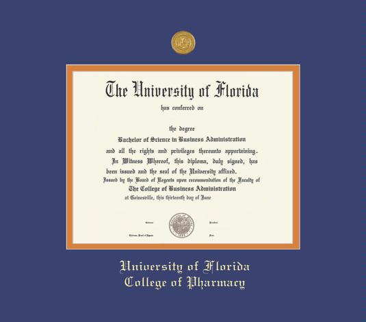 University of Florida Diploma - College of Pharmacy Frame with Medallion and Royal Blue and Orange Double Mat and Gold Embossing