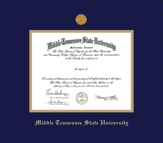Middle Tennessee State University Diploma - MA/PhD (12/12 to Present) Frame with Medallion and Navy Blue and Gold Double Mat and Gold Embossing