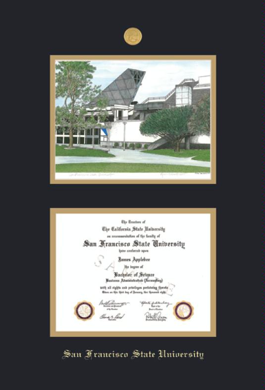 San Francisco State University Diploma (1/15 to Present) and Litho Frame with Medallion and Black and Gold Double Mat and Gold Embossing