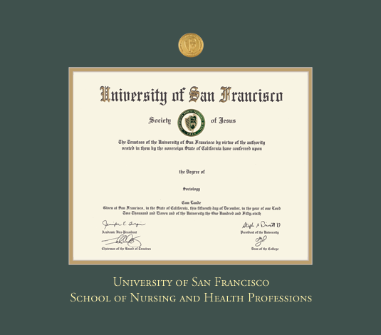 University of San Francisco Diploma - Nursing (BA) Frame with Medallion and Green and Gold Double Mat and Gold Embossing