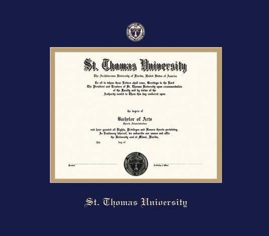 St. Thomas University Diploma - PhD Frame with Navy Blue and Gold Double Mat and Gold Embossing