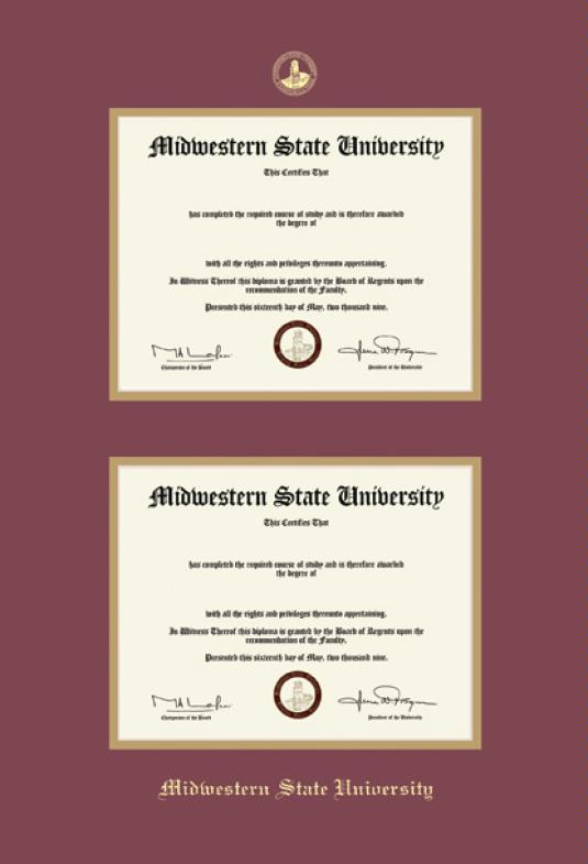 Midwestern State University Double Diploma - BA/MA Frame with Maroon and Gold Double Mat and Gold Embossing