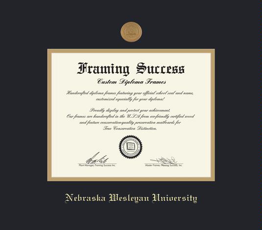 Nebraska Wesleyan University Diploma Frame with Medallion and Black and Gold Double Mat and Gold Embossing
