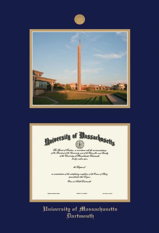 University of Massachusetts- Dartmouth Diploma (Pre 2020) and Photo Frame with Medallion and Navy Blue and Gold Double Mat and Gold Embossing