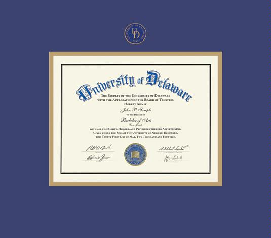 University of Delaware Diploma (5/17 to Present) Frame with Medallion and Royal Blue and Gold Double Mat and Gold Embossing