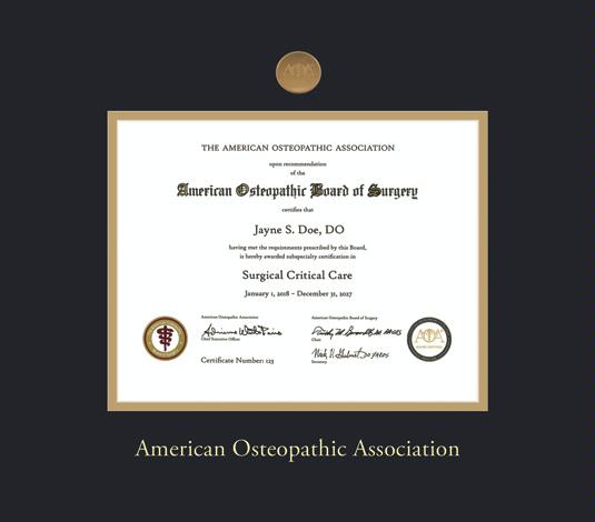American Osteopathic Association Certificate Frame (certificates issued May 2017 and beyond) with Medallion and Black and Gold Double Mat and Gold Embossing