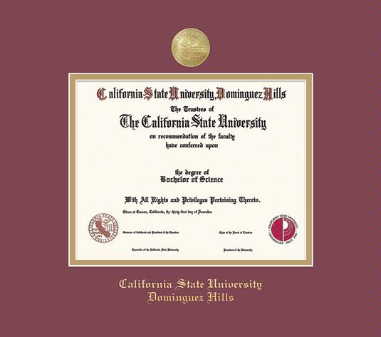 California State University- Dominguez Hills Diploma (7/17 to Present) Frame with Medallion and Maroon and Gold Double Mat and Gold Embossing