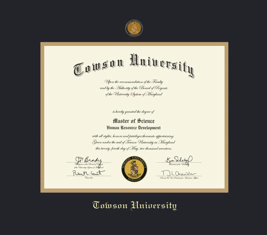 Towson University Diploma Frame with Enameled Medallion and Black and Gold Double Mat and Gold Embossing