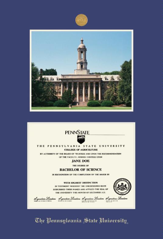 Pennsylvania State University Diploma and Old Main Photo Frame with Medallion and Navy Blue and Cream Double Mat and Gold Embossing