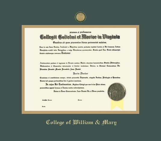College of William and Mary Diploma - BA/MA (3/18 to Present) Frame with Colored Medallion and Green and Gold Double Mat and Gold Embossing
