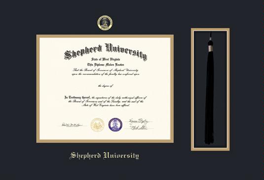 Shepherd University Diploma (3/05 to 8/24) Frame with Tassel Cut-out and Black and Gold Double Mat and Gold Embossing