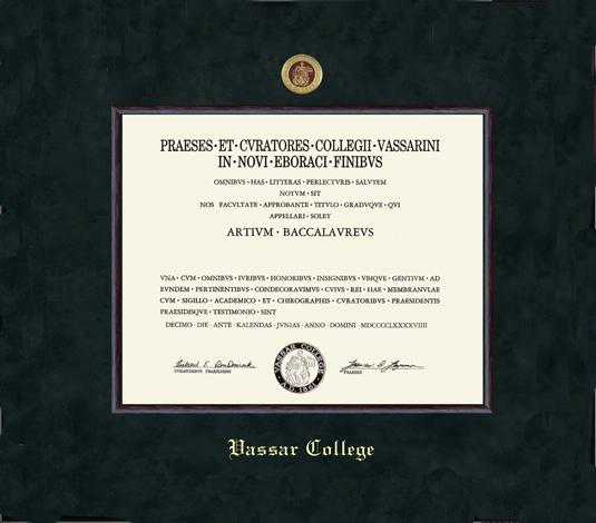 Vassar College Diploma Frame with Medallion and Black Suede and Wood Fillet Double Mat and Gold Embossing