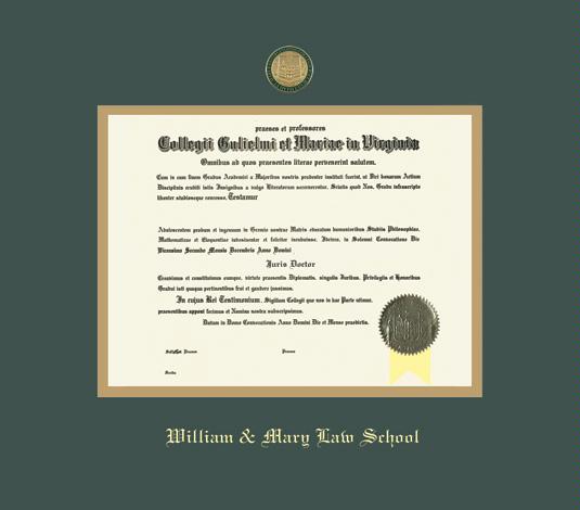 College of William and Mary Diploma - Law (6/18 to Present) Frame with Colored Medallion and Green and Gold Double Mat and Gold Embossing