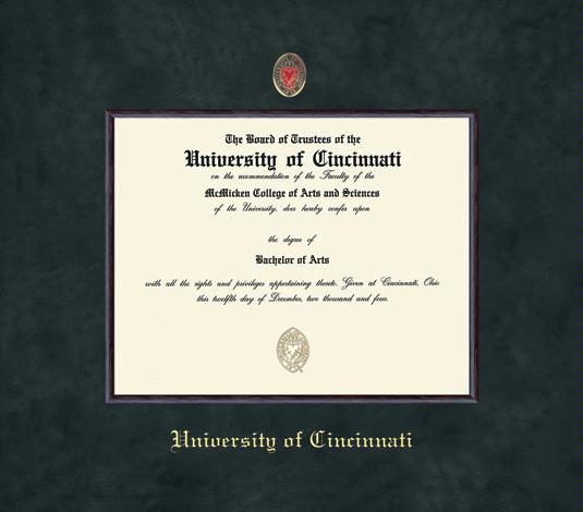 University of Cincinnati Diploma - BA/MA (2016 to Present) Frame with Medallion and Black Suede and Wood Fillet Double Mat and Gold Embossing