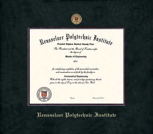 Rensselaer Polytechnic Institute (NY) Diploma (7/18 to Present) with Enameled Medallion and Black Suede and Wood Fillet Double Mat and Gold Embossing