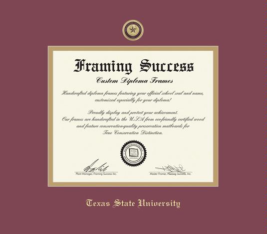 Texas State University Diploma (11/18 to Present) Frame with Medallion and Maroon and Gold Double Mat and Gold Embossing
