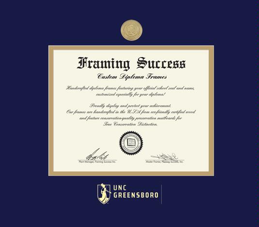 University of North Carolina at Greensboro Diploma - BA (2019 to Present) Frame with Medallion and Navy Blue and Gold Double Mat and Gold Embossing