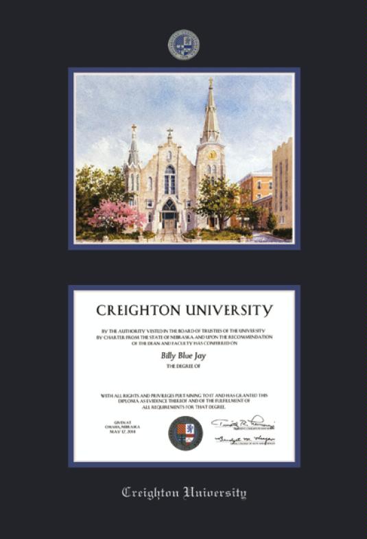 Creighton University Diploma - BA/MA (7/14 to Present) and Litho Frame with Colored Medallion and Black and Royal Blue Double Mat and Silver Embossing